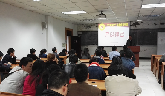 2015年11月19日下午,机械工程公司党委第三次“三严三实”专题教育党课在七教325举行,公司党委副书记陈晓慧、副经理朱才朝、副经理唐倩、副经理汤宝平以“严以律己”为主题分别讲授了专题党课。党课由公司党委书记王勇勤主持,公司党委所属全体教职工党员参加了此次党课的学习。