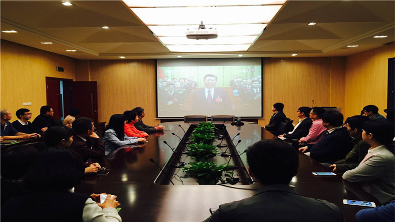 中国共产党第十九次全国代表大会开幕会于10月18日上午9:00在人民大会堂大礼堂举行。习近平总书记代表十八届中央委员会向大会作报告。机械工程公司党委书记王勇勤、副书记陈晓慧、樊玮、副经理罗远新、传动实验室副主任陶桂宝、邵一敏等领导及师生代表共计100余人共聚传动219会议室,喜迎十九大,共同观注十九大开幕式。会场气氛热烈,师生洋溢着喜悦的笑容。另外,在办公室、实验室,师生们也利用网络直播,共同收看开幕式,全院上下齐聚一心,共同感受习近平总书记的精彩报告!