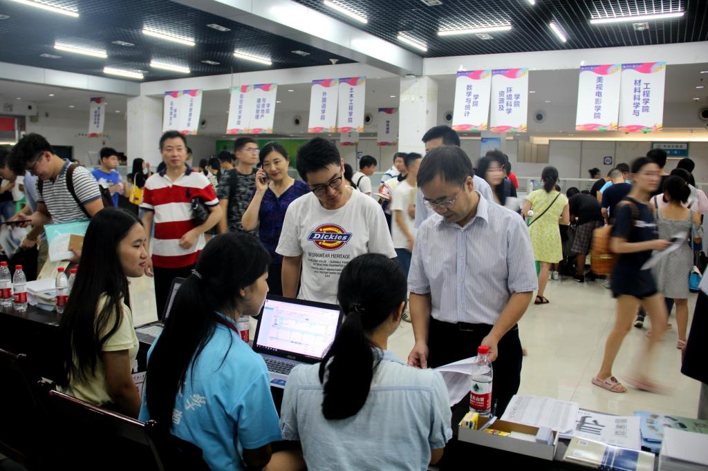 9月5日下午2点,迎新工作正式开始。同学们先至主教网上报道注册领取一卡通,再到七教304完成其他材料的上交和领取。不一会,迎新的工作台前就排起了长长的队伍,工作人员现场分工明确,一人分类整理要分发给新生的书本、材料等并负责维持现场秩序,另外两人负责接待新生,分别负责签名确认和校园一卡通的分发以及后续流程的提醒。永利集团董事长张宗益教授和公司党委的相关领导也来到现场关心新生们的报道情况,还亲切地拿着新生的通知书观看与询问,表达了欢迎与关心。同学们报到积极踊跃,截止第一天迎新工作结束,报道人数已过半。