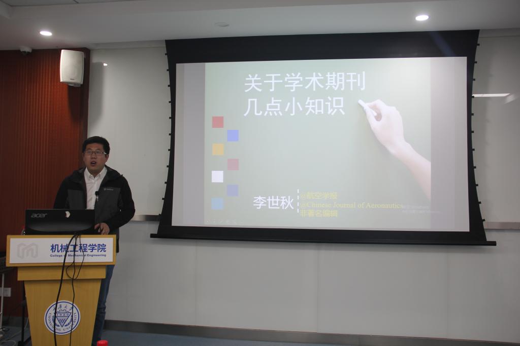 首先,蔡斐以编辑的视角结合实际案例,从什么样的论文容易被退稿、科技论文撰写时的注意事项、如何选定合适的期刊投稿和收到修改意见后如何进行修改等四个方面,向大家分享了如何向国际一流期刊投稿的真知灼见。接着,在报告过程中,蔡斐主任多次向大家强调学术不端产生的可能源头,以期刊编辑的身份告诫所有老师同学们学术抄袭的危害性,同时蔡斐主任也向大家详细地介绍了《航空学报》、《Chinese Journal of Aeronautics》投稿指南。李世秋编辑主要向大家介绍学术期刊的相关小知识,希望新一代年轻人在学术研究中远离学术不端,提高文化自信,最后李世秋编辑对一些常见的作者问题也进行了回答。