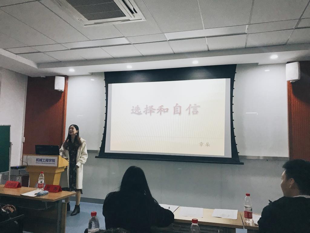 最后一个上台为大家分享的是生物工程学院的章朵,她也是本次来为大家进行分享的唯一一位女生。章朵师姐没有像前面的几位师兄为大家带来求职方面的经验和收获,她给大家带来分享的主题是选择和自信。她由自身从医学转向生物工程方向,又在求职中转向与专业无关房地产岗位的经历讲起,教会了大家要敢于做自己喜欢的事情,做出自己想要的选择。最后章朵还通过自身的学习科研、员工工作等的经历,为大家现身说法,强调了自信的重要性,告诫大家活出真实的自己,不要在意他人的看法!