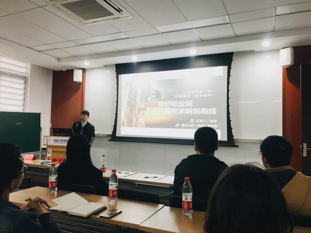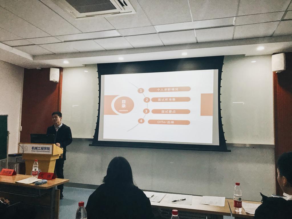 首先为大家进行分享的是来自机械工程学院的赵游,分享的主题是“做好求职规划,赢在起跑线”。他从自我分析、外界环境、职业决策、实施计划四个方面给大家进行经验分享。古人有曰:知己知彼,百战不殆,然而知己应是首要任务。进行自我分析对每个人来说都是非常有必要的,人在不断的变化、进步,自我的分析也应该不断的更新。而影响规划的因素,一部分来自个人的性格、特质和喜好这些主观条件,还有很大一部分来自客观选择即职业环境,认真分析职业环境,将给我们的职业规划带来更多的选择。