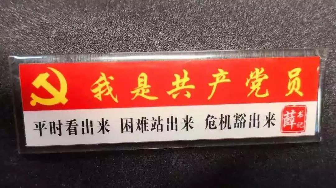 薛荣和党员职工的胸前都佩戴着一个醒目的身份牌,上面印着“我是共产党员:平时看出来、困难站出来、危机豁出来”的字样。