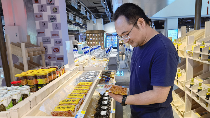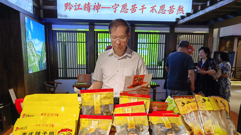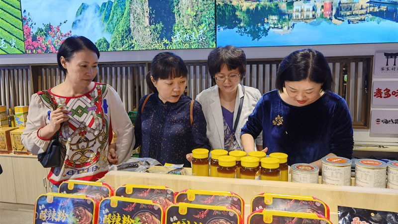 各个货架上摆满了琳琅满目的特色农产品:石柱的黄精饮料、南川的竹笋、城口的老腊肉等,还有新疆的哈密瓜、青海的牦牛肉,各个地方的优质特产汇聚于此,极大的激发了老师们的购买热情。