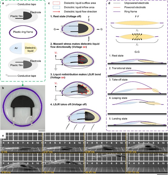 图示:(a)驱动器的结构组成。(b)机器人实物样机。(c)机器人的跳跃过程简图。(d)驱动器变形过程的截面图。(e)机器人跳跃过程的高速相机拍摄图。