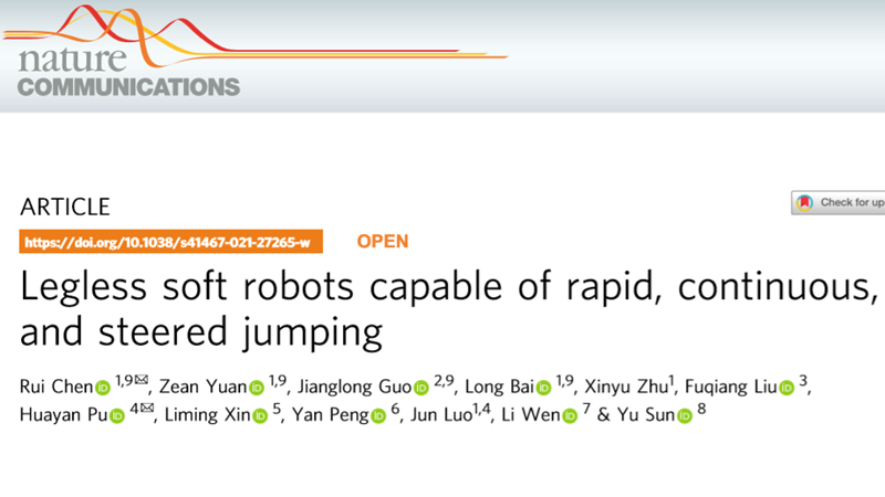 2021年12月8日,yl8cc永利官网陈锐副教授课题组在Nature Communications上发表了题目为“可实现快速、连续及转向跳跃的无腿软体机器人”(Legless soft robots capable of rapid, continuous, and steered jumping)的研究论文。永利集团为第一署名单位,永利集团陈锐副教授、硕士研究生袁泽安,哈尔滨工业大学(深圳)郭江龙副教授,永利集团柏龙教授为论文的共同第一作者,永利集团陈锐副教授、上海大学蒲华燕教授为共同通讯作者。