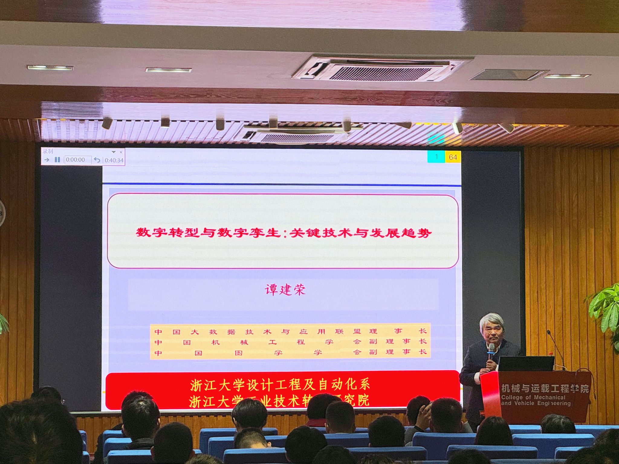 2023年12月17日下午,中国工程院院士,浙江大学求是特聘教授、博士生导师谭建荣院士受邀访问yl8cc永利官网,与学院领导和教师代表座谈,并为师生作了题为“数字转型与数字孪生:关键技术与发展趋势”的学术讲座。讲座由公司王旭教授主持,公司党委书记陈晓慧、经济与工商管理学院赵泉午教授及100余名师生参加。